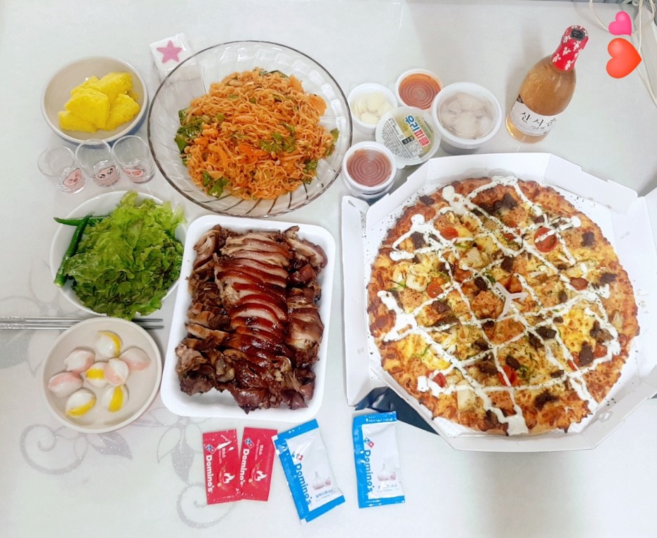 우리 조카가 사준 피자랑 족발 그리고 비빔면~ 상추랑 양파 넣고 만들었어요.