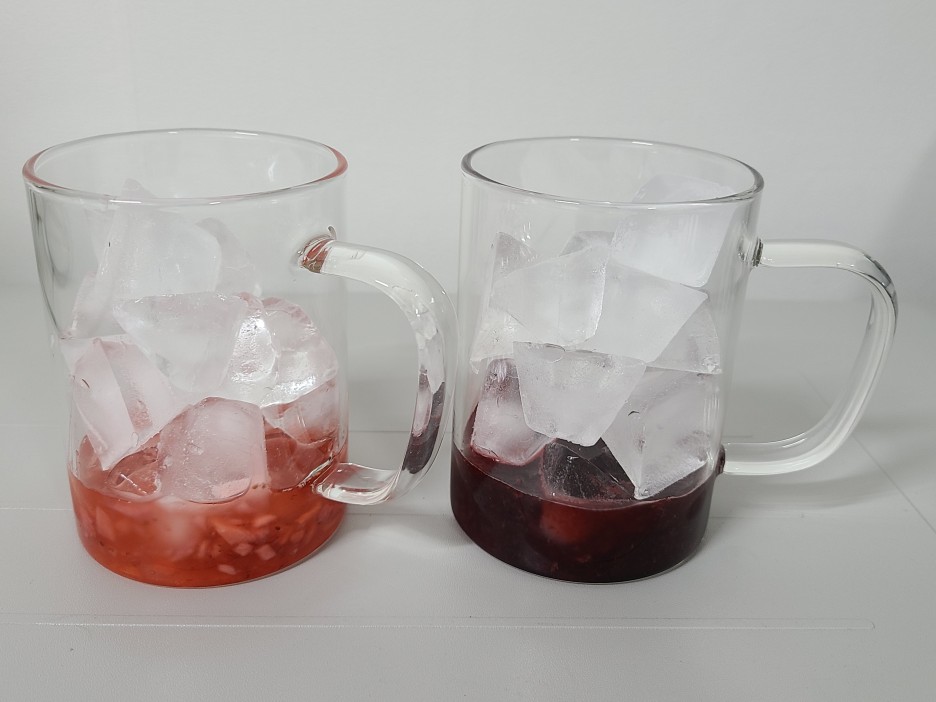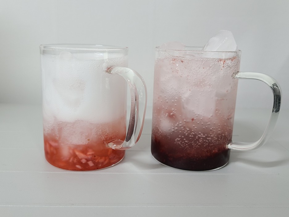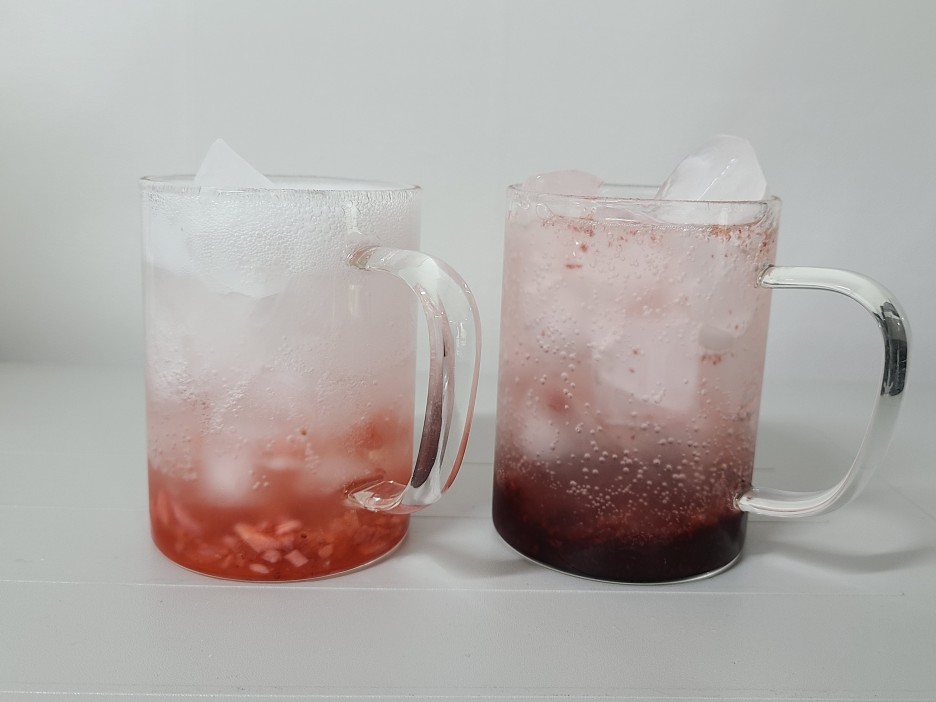 왼쪽 컵에는 딸기청 4스푼, 오른쪽 컵에는 체리청 3스푼을 넣어주었습니다.