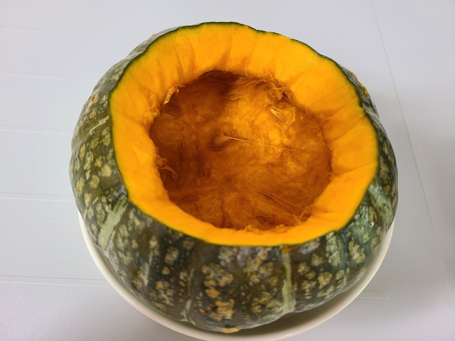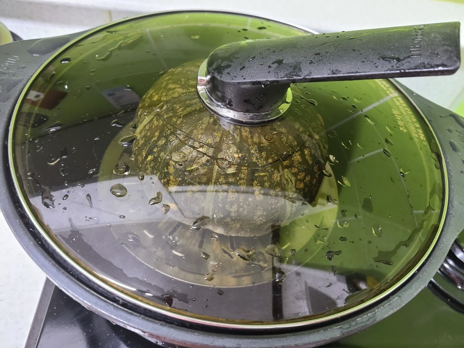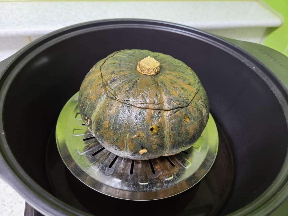 단호박 윗부분을 잘라준 후에 버리지 마시고 뚜껑으로 사용해주세요!
