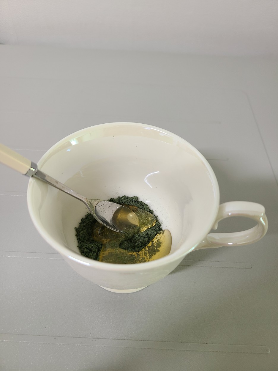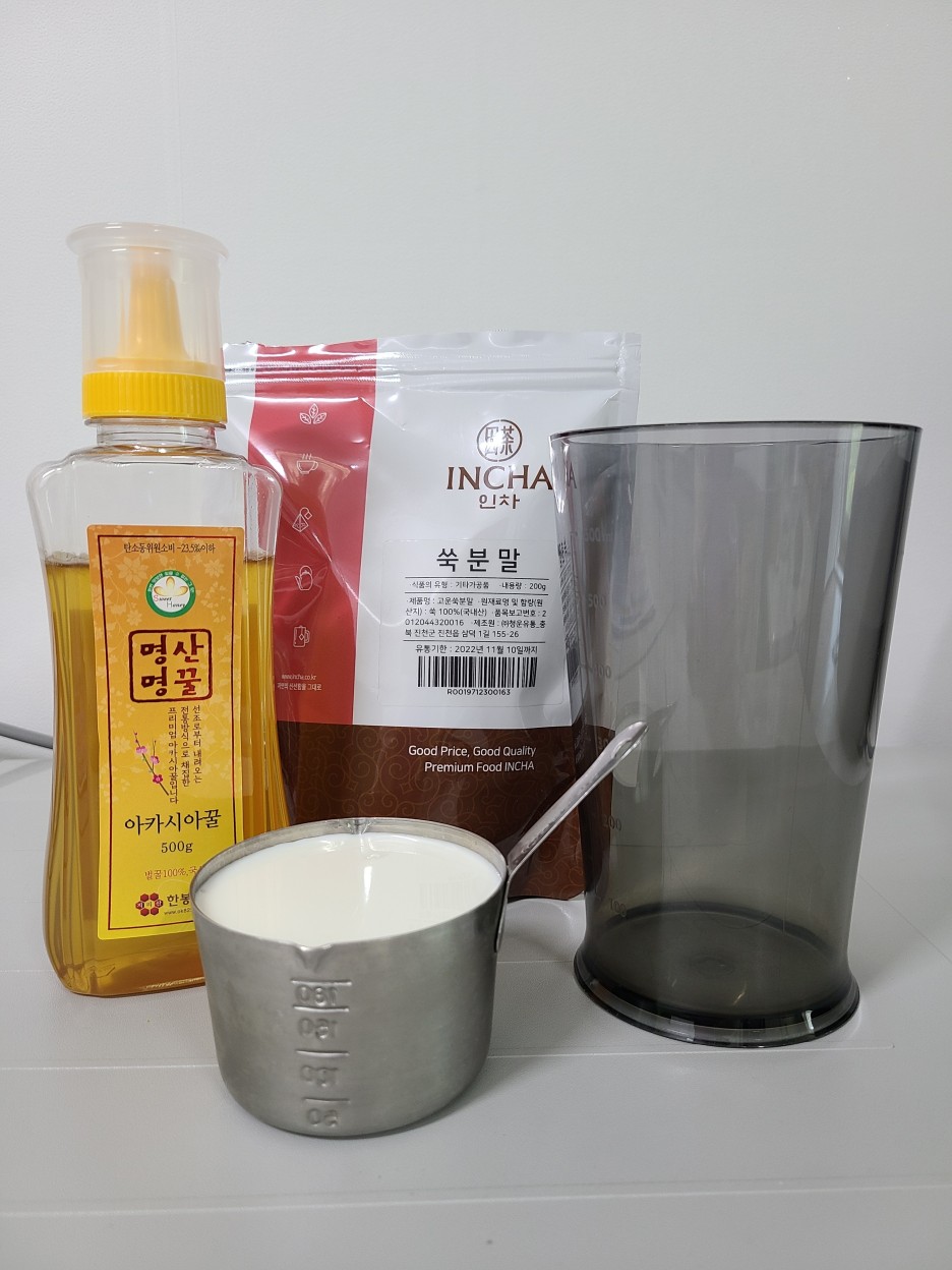 우유 200ml, 꿀 한 큰술, 쑥 분말 한 작은 술 넣고 잘 저어주세요.