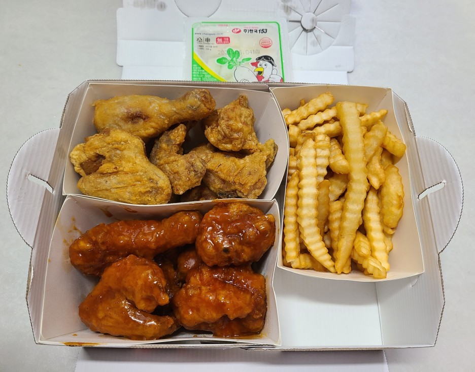 처갓집 반반 치킨으로 시켜봤어요.