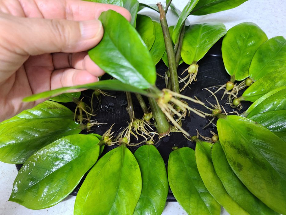 두 달 전에 금전수 줄기는 흙꽂이를 해주고, 잎은 물꽂이를 해주었는데