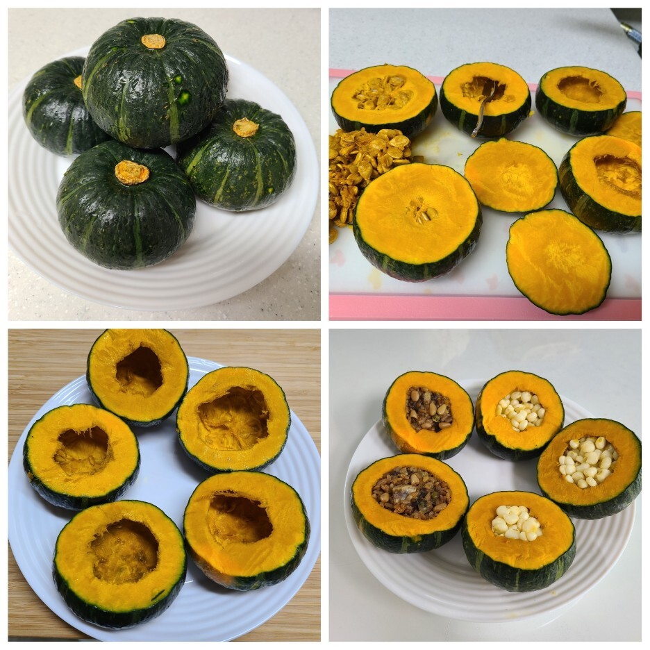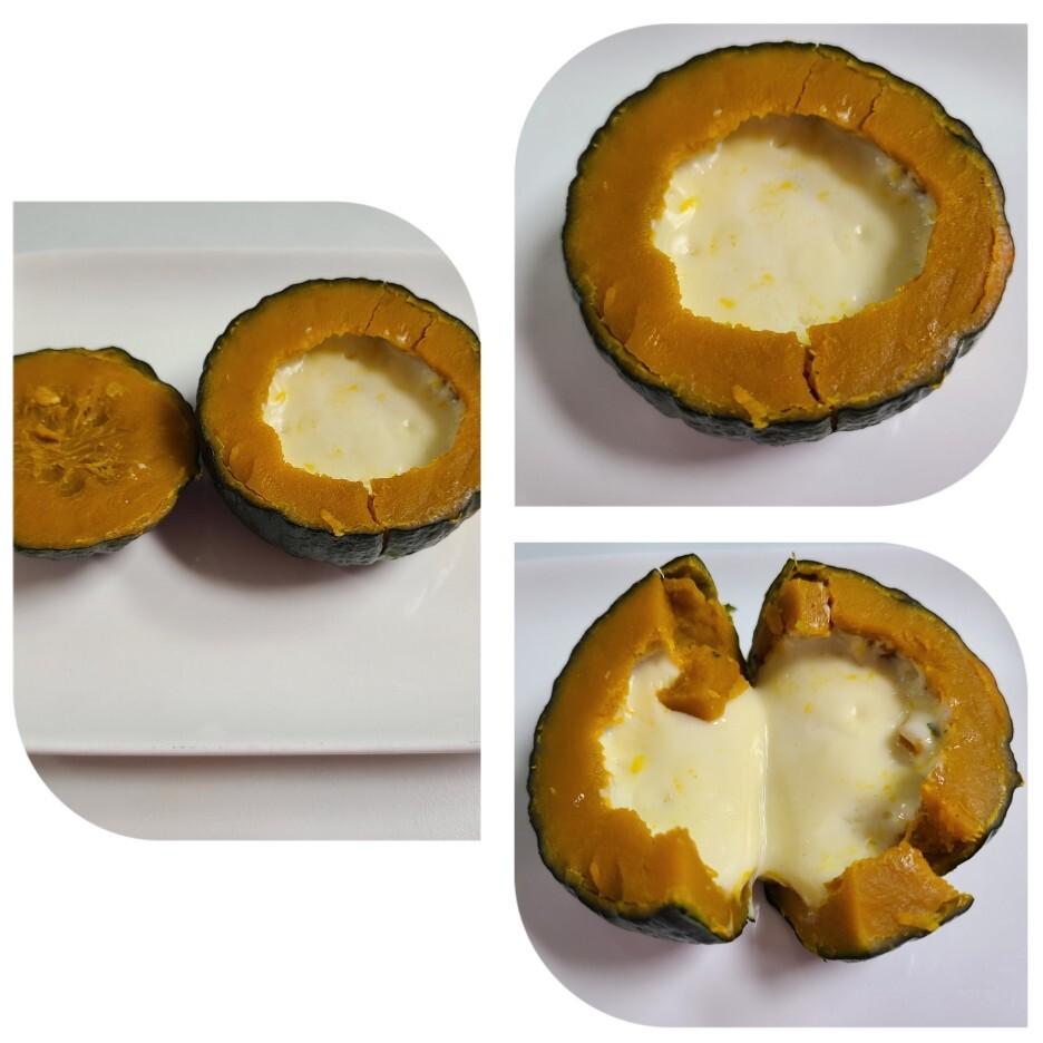 오늘 찰옥수수와 치즈를 넣고 만든 단호박 찜입니다.