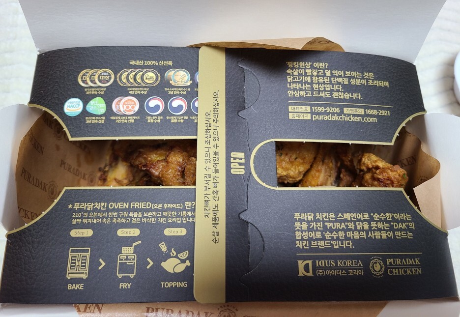 푸라닭 부직포 가방 안에 오늘 메뉴가 들어있습니다.