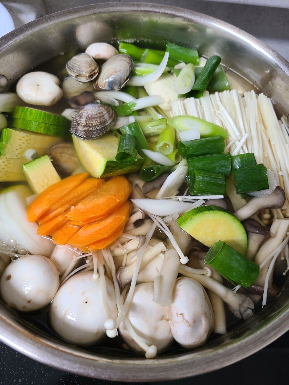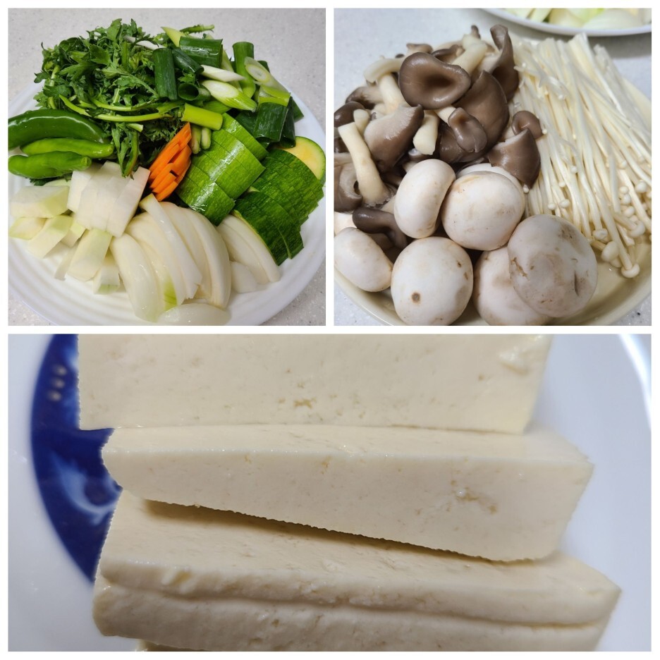 냉장고에 있던 쑥갓이랑 채소 그리고 버섯이랑 두부도 준비했어요.