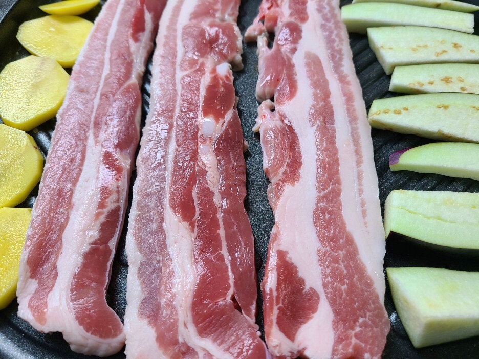 삼겹살 세 줄과 감자와 가지까지 올려서 구울 수 있어요~^^