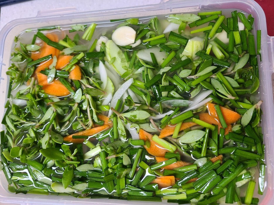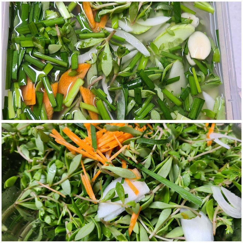 당근, 양파, 마늘, 부추, 오이를 넣고 물을 부어 주었습니다.