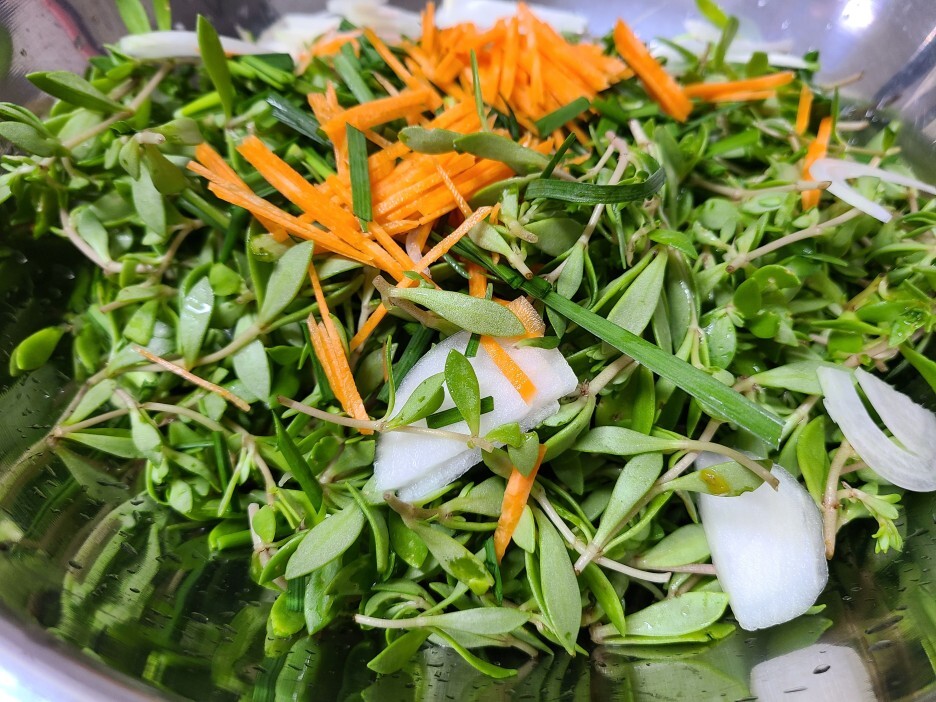 남은 돌나물은 당근, 부추, 양파를 썰어서