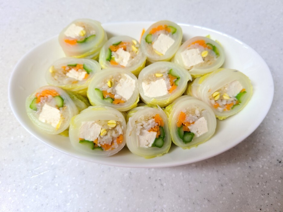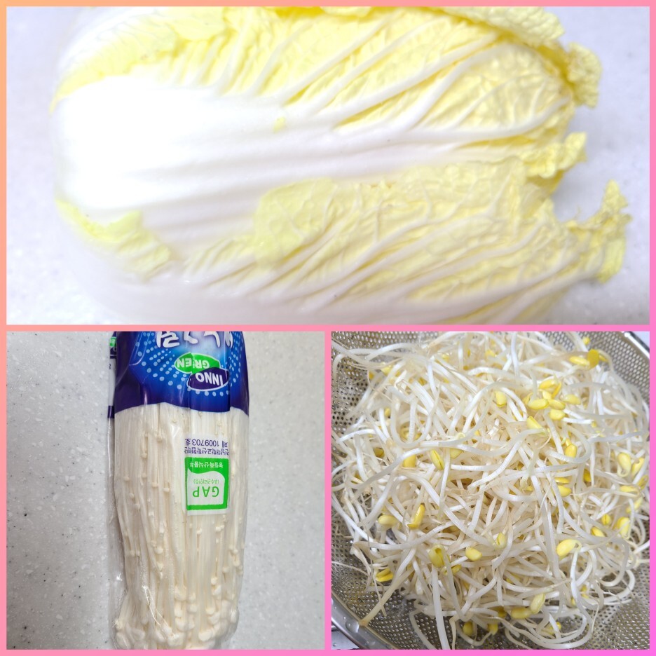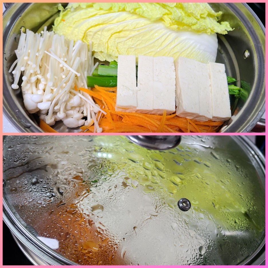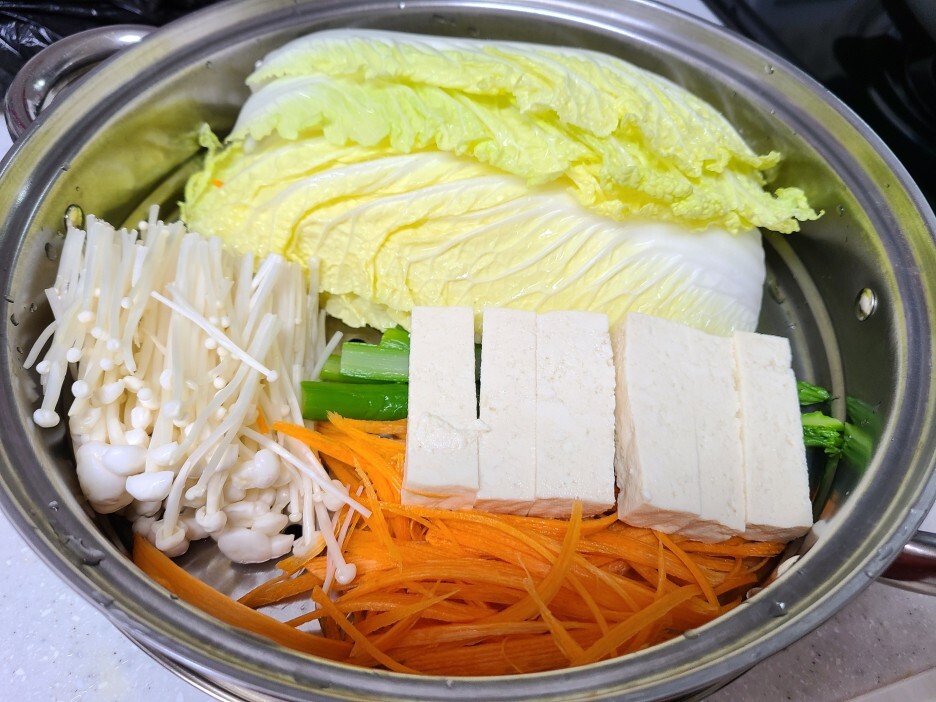 알배기 배추, 당근, 두부, 아스파라거스, 콩나물, 팽이버섯을