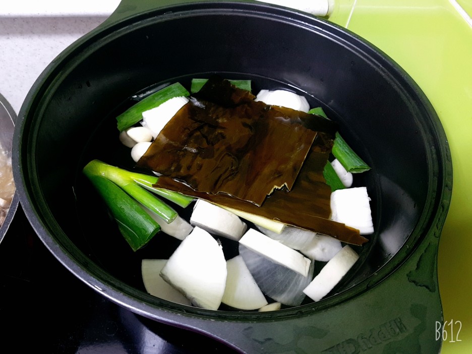 무, 대파, 통마늘, 다시마, 양파, 생강으로 육수를 만들어 주세요~