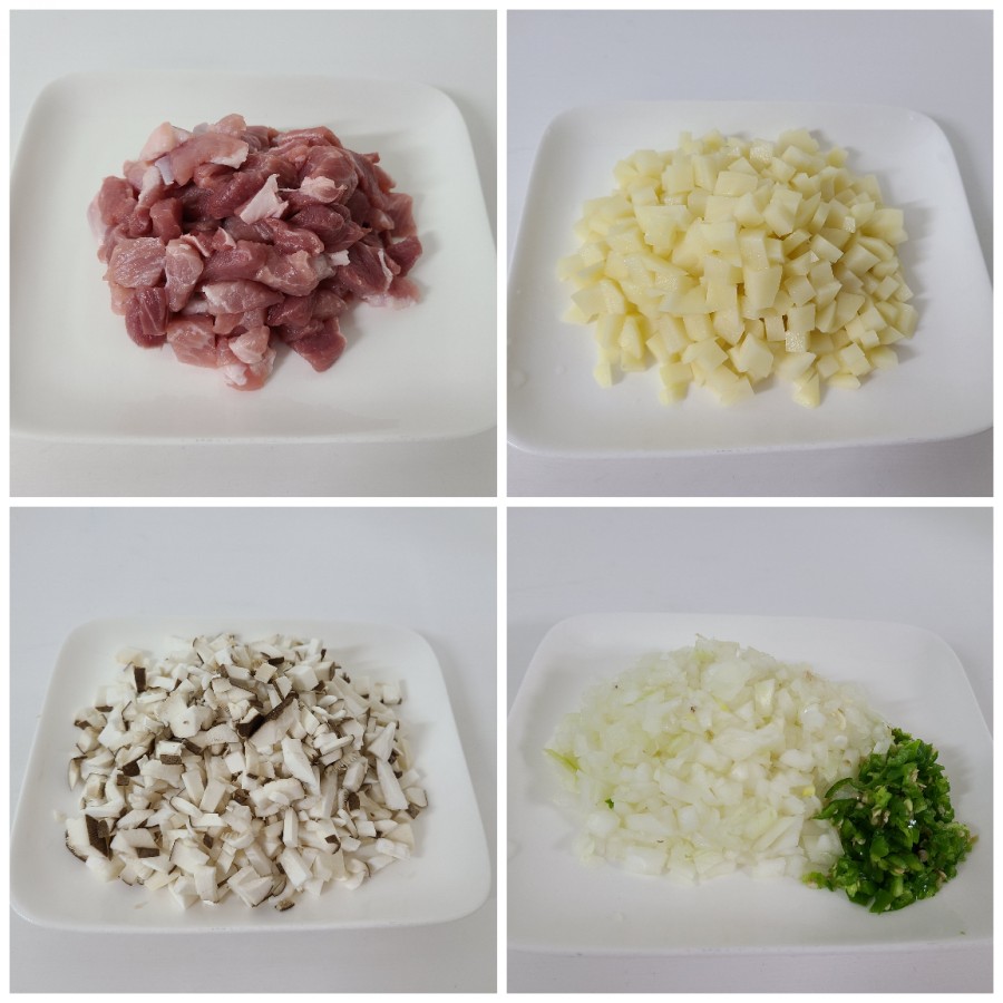 돼지고기 앞다릿살, 감자 2개, 새송이버섯 2개, 양파 1개 반, 청양고추 3개